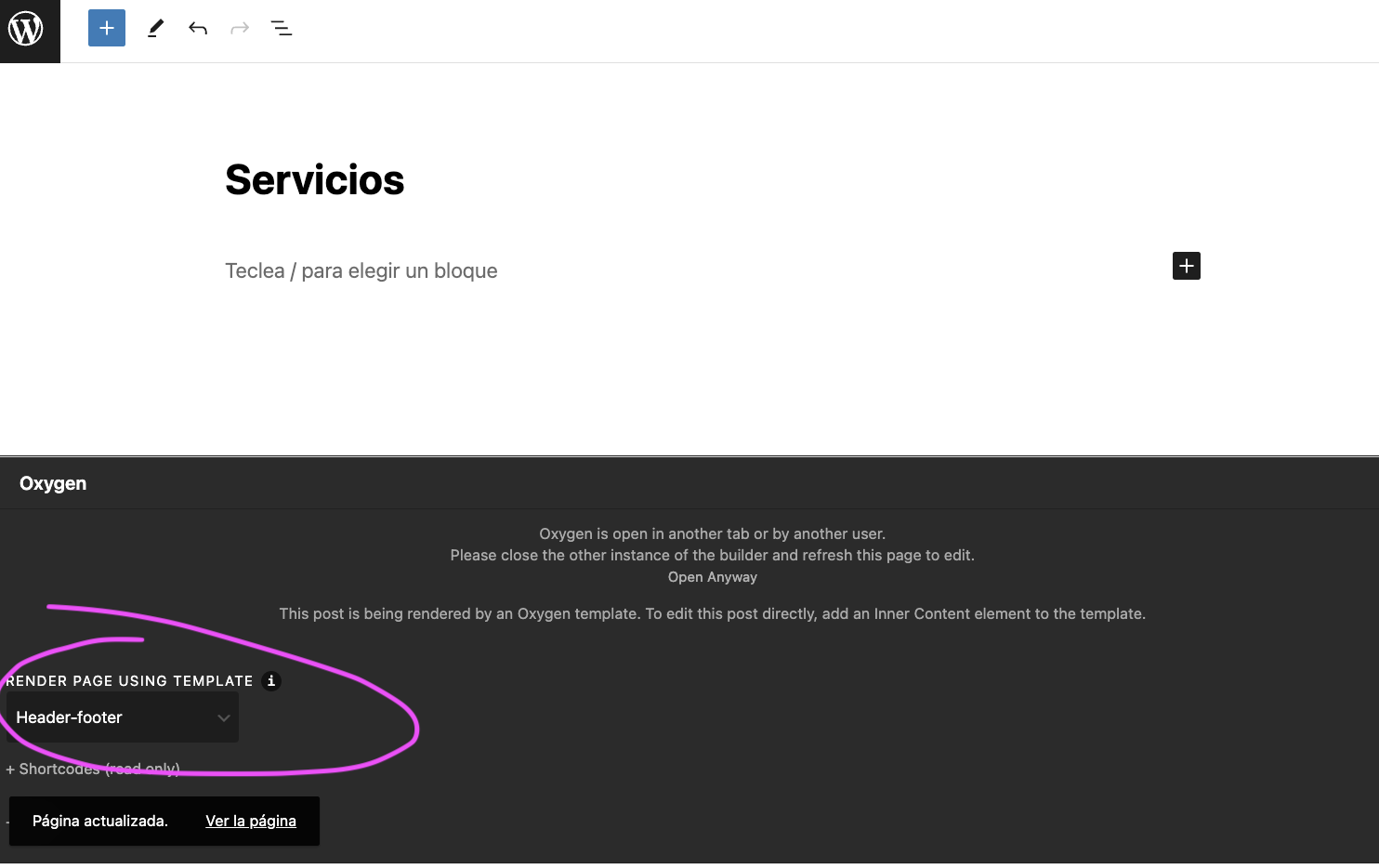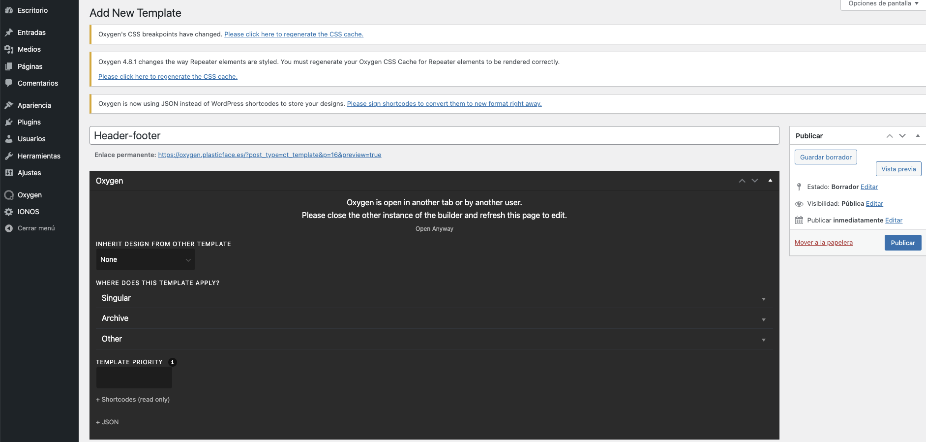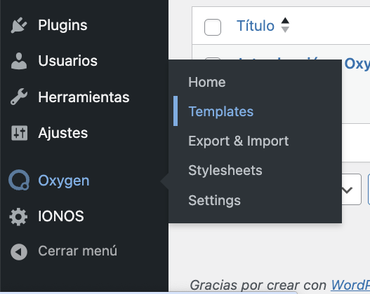 Para ello iremos al menú principal de Wordpress Oxygen>>Templates.