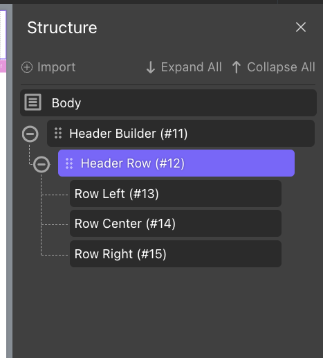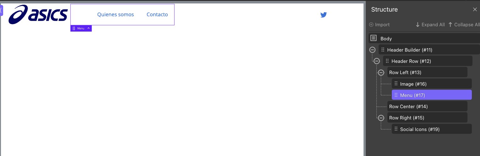 Vamos a montar un menú clásico, del tipo logo izquierda, menú centrado e iconos de redes a la derecha. Para ello vamos al buscador de elementos de estructura, botón + y escríbimos Header builder, al clicar sobre este elemento nos montará una fila header con tres elementos: left, center y right.
