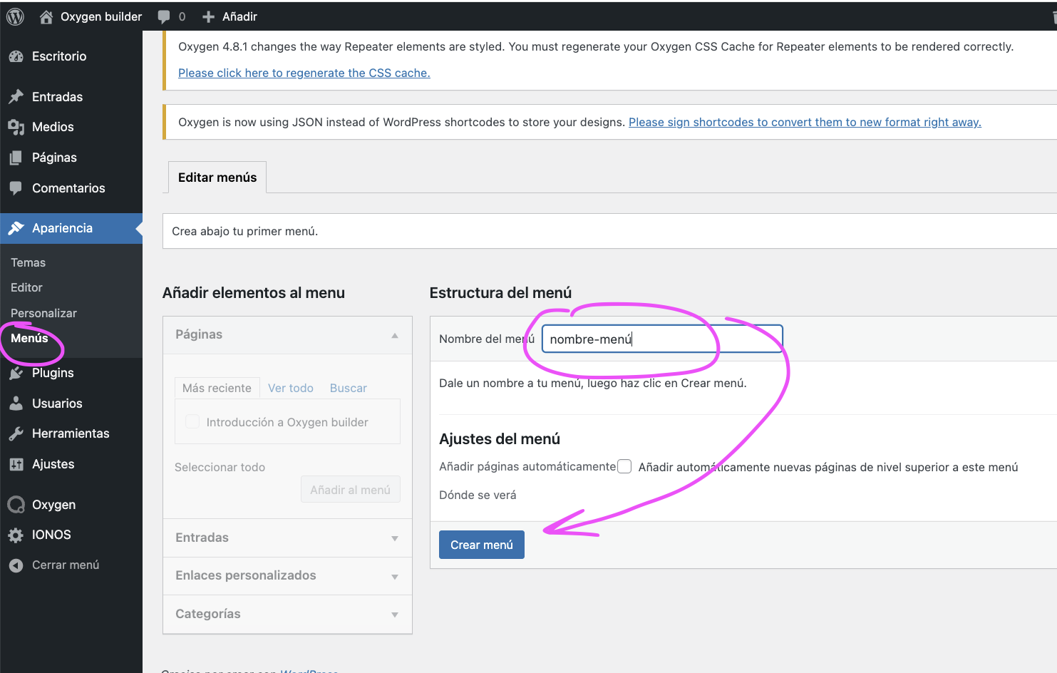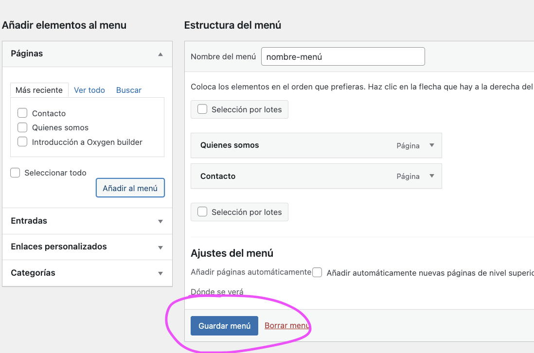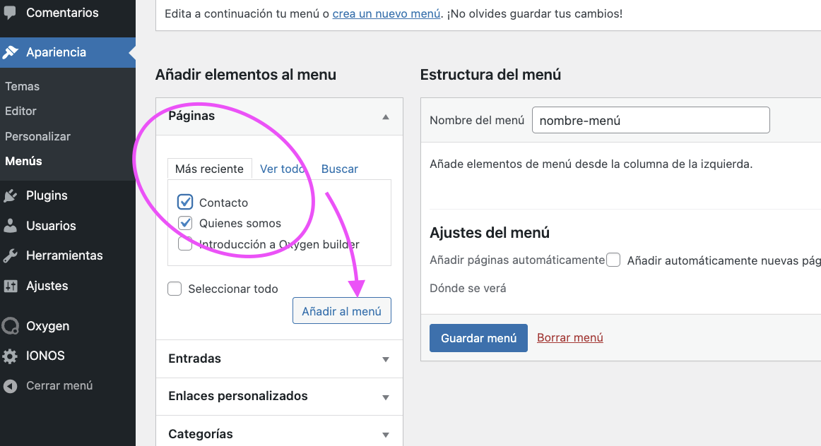 IMPORTANTE: para seleccionar las páginas que irán en nuestro menú de navegación, las podemos seleccionar si vamos al menú propio de Wordpress, Apariencia>>>Menús.