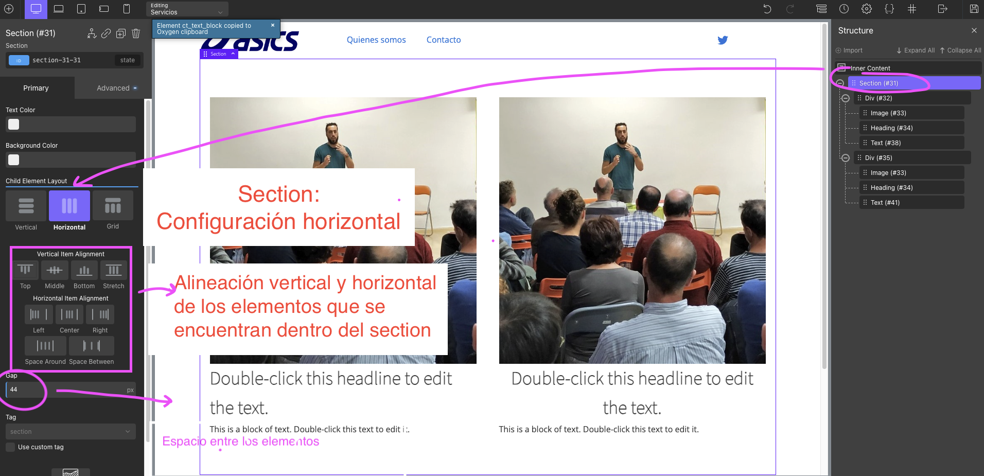 En el trimestre pasado vimos como maquetar con el sistema de CSS Flexbox. En Oxygen builder podemos controlar la distribución de los elementos, en vertical, horizontal y distribuirlos dentro de sus contenedores.