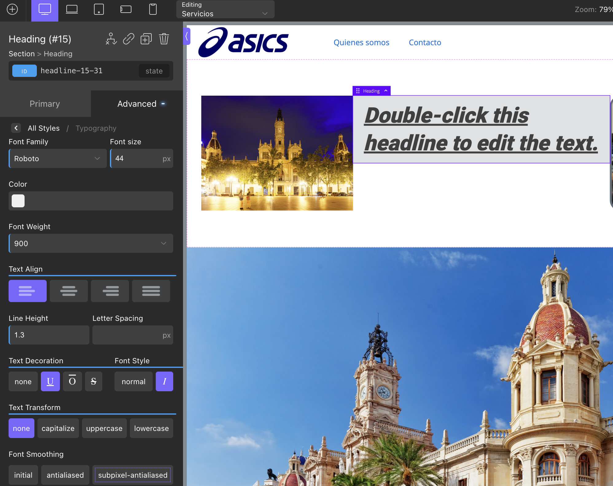 Para modificar tipografía: color, interlineado, justificación, peso (bold, regular,...), encontraremos todas estas opciones en la pestaña Advanced>>Tipography
